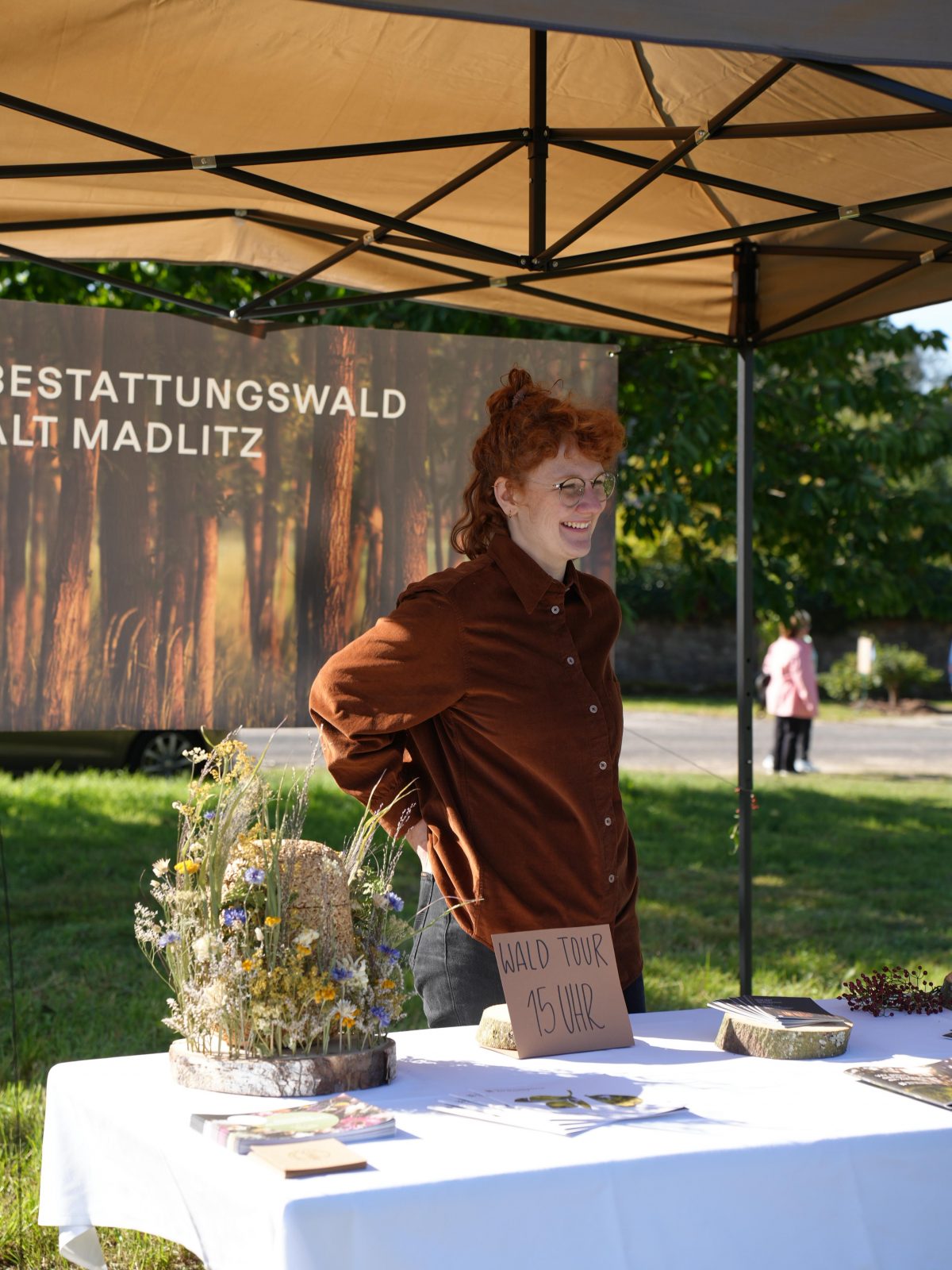 Auch Elsa wird wieder einen Stand auf dem Fest betreuen, an dem es viele schöne Infomaterialien, Urnen zum Anfassen, Anregung zur Auseinandersetzung mit Tod, Trauer & Abschied und vor allem die Möglichkeit für ganz viel persönlichen Austausch gibt. Um 15 Uhr gibt es eine Waldführung. Achtung: Der Treffpunkt ist ausnahmsweise unser Stand auf dem Fest, nicht wie sonst der Eingang des Bestattungswaldes. Wir brechen von dort gemeinsam auf in Richtung Wald, der fußläufig gut zu erreichen ist. Wenn ihr am Wald auf uns warten möchtet, reicht es, wenn ihr zwischen 15:10 und 15:15 Uhr dort seid.
